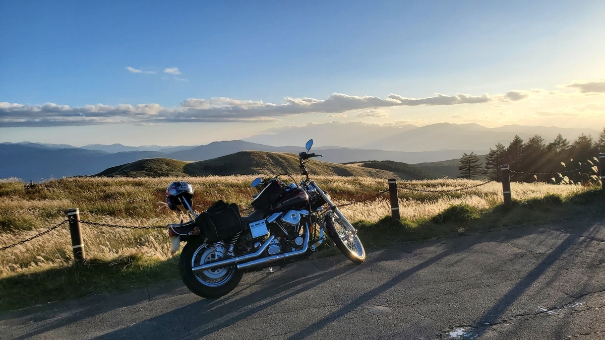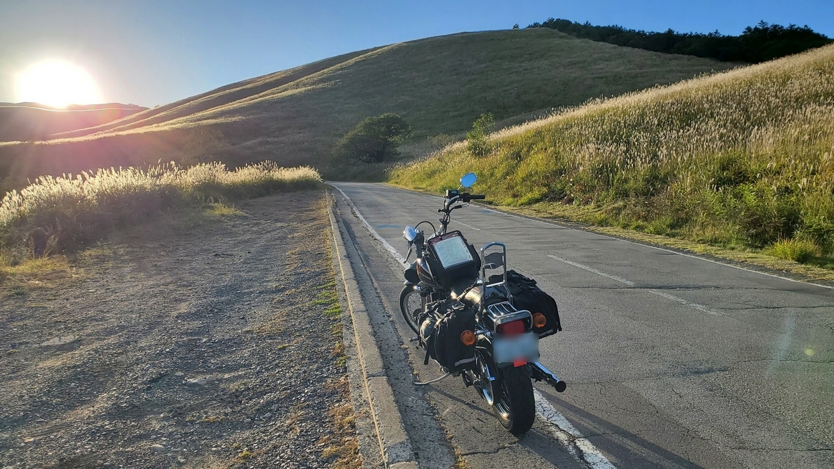 夕日に照らされ輝くススキの草原の中を走り富士見台へ